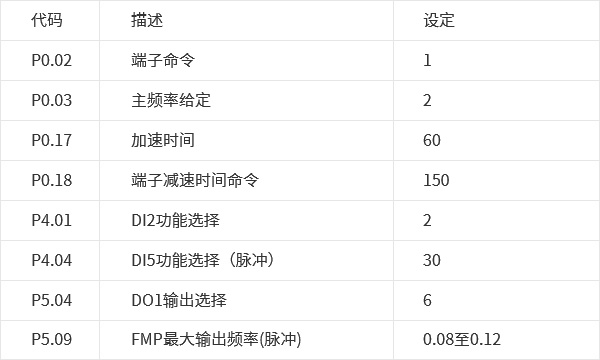 1、接線 ①輸入(主電源)R S T ,輸出(電機)U V W ②啟動信號 DI1正轉(zhuǎn) DI2反轉(zhuǎn) COM公共端 ③故障接點 TC1 TB1 ④頻率給定 AI1 10V GND ⑤FM COM 脈沖接收 ⑥D(zhuǎn)O1 GND 電機報警 ⑦GND與COM短接,DI5與FM短接 | 2、變頻器內(nèi)置參數(shù)